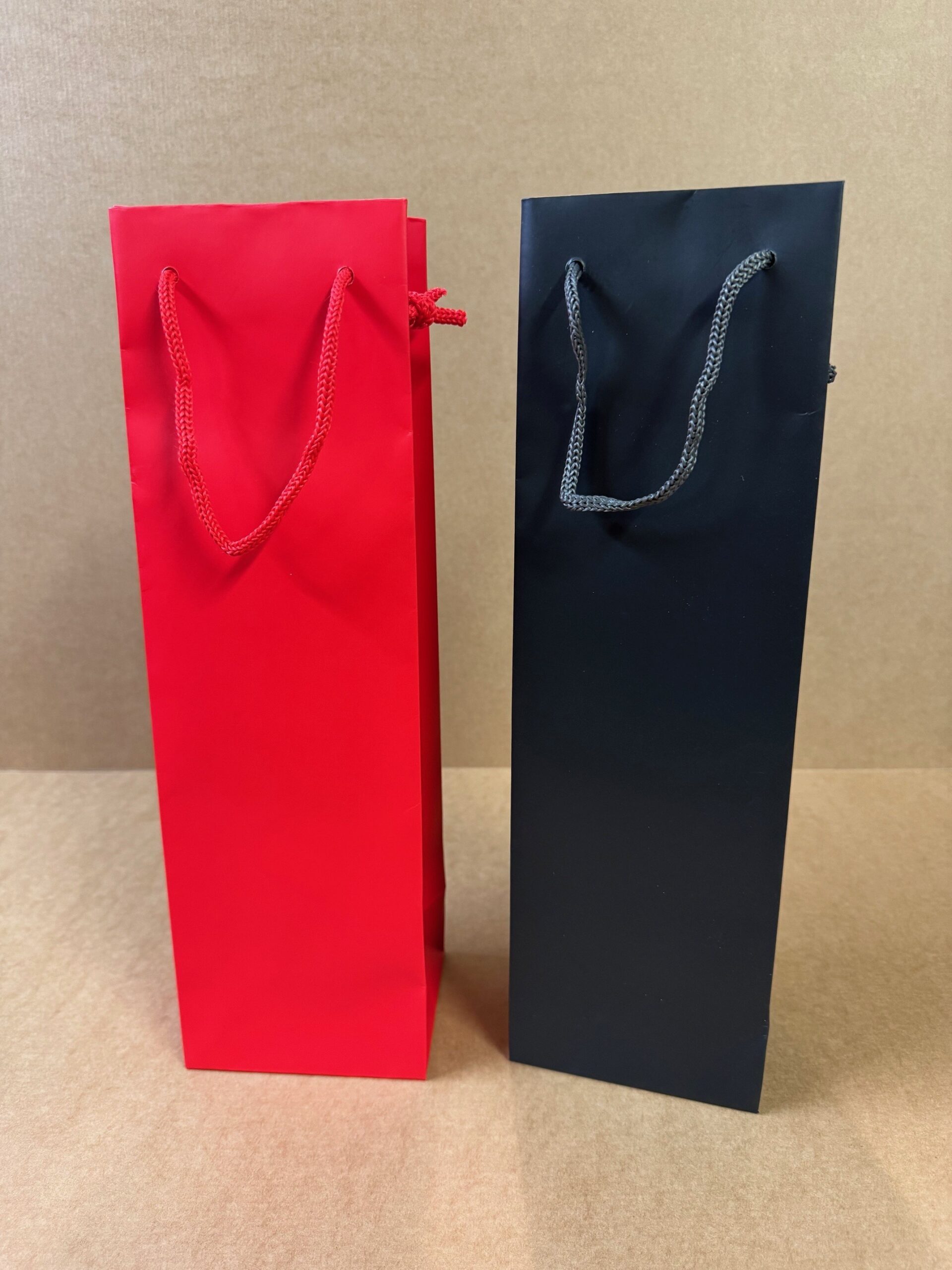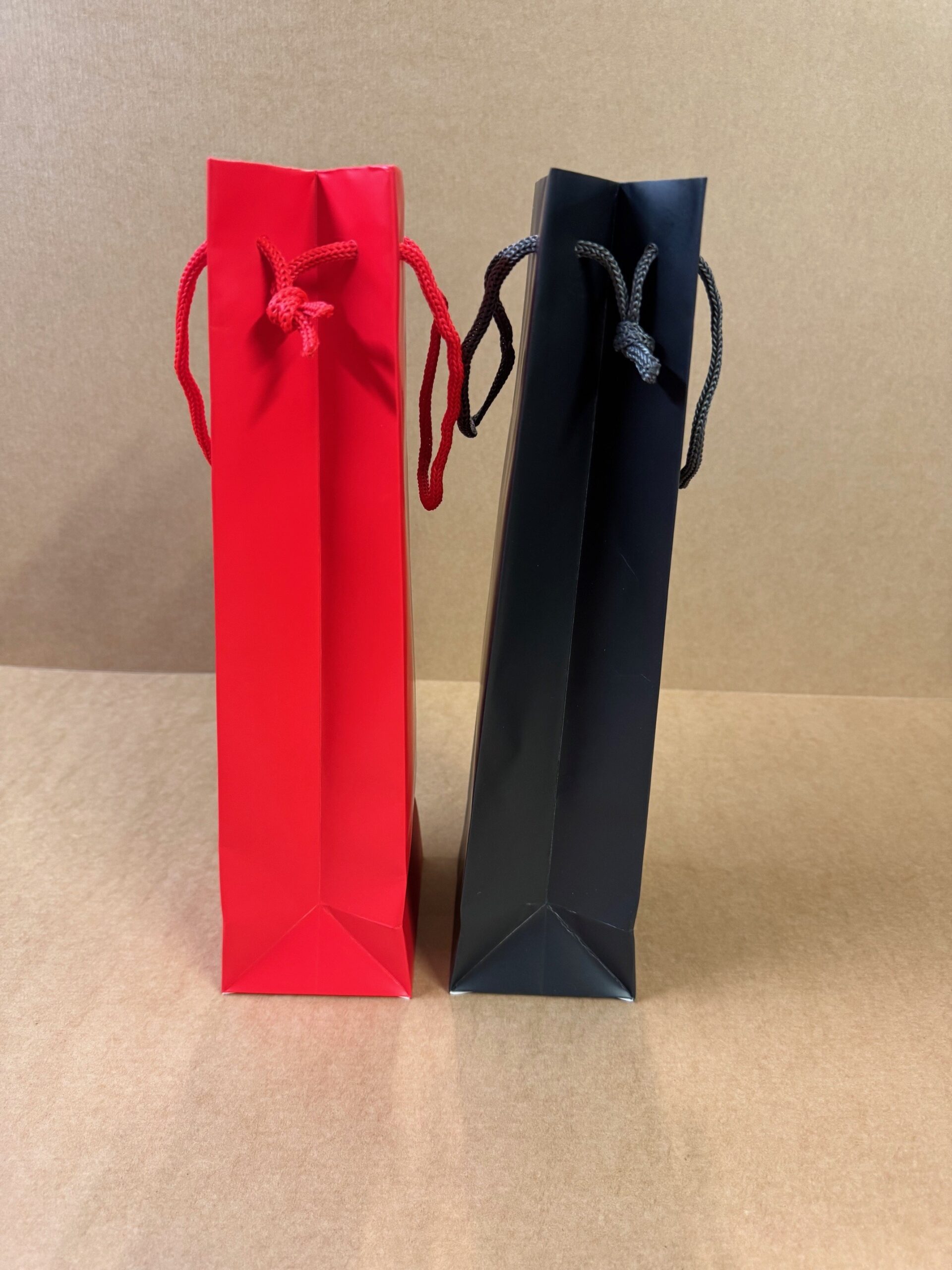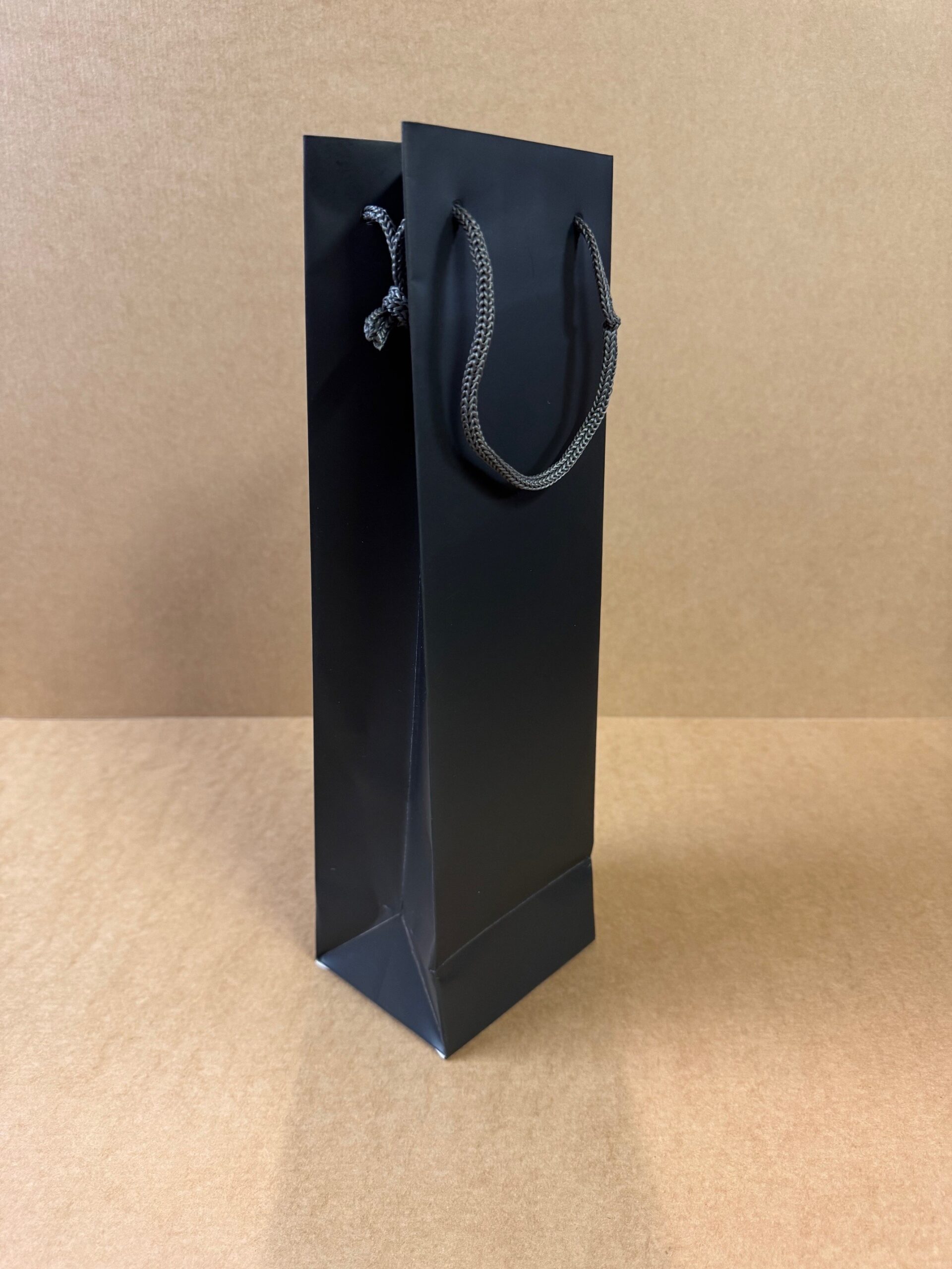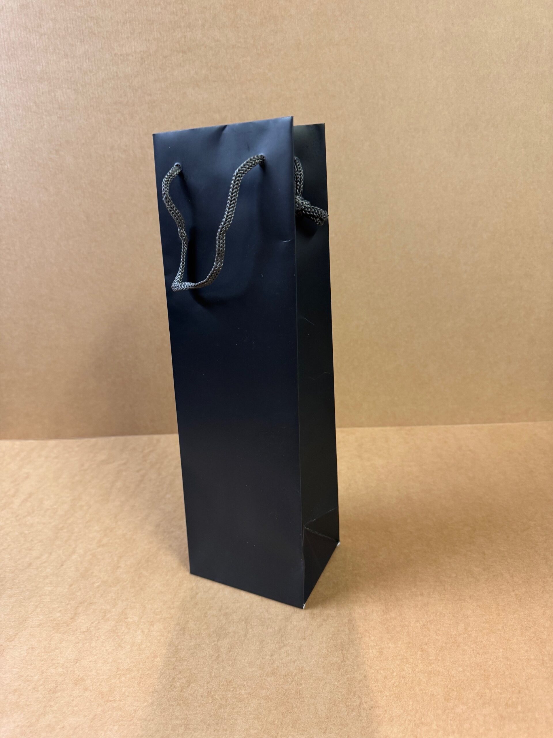 Svartir vandaðir flöskupokar með svörtu snúru bandi í stærðinni 110x90x360mm. Seldir stakir.